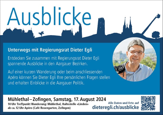 Unser Regierungsrat Dieter Egli besucht am Samstag, 17. August 2024 die Region und wird um 10 Uhr von Mühlethal (Treffpunkt Bushaltestelle "Linden") nach Zofingen wandern. Alle sind herzlich eingeladen, mitzukommen! Wer Dieter schon einmal auf einer seiner Wanderungen begleitet hat, weiss, wie viel Spannendes aus der Politik man da ganz nebenbei auch noch erfährt. Am Ende (ca. ab 12 Uhr) wird im Rosengarten in Zofingen ein Apéro offeriert. Es ist problemlos möglich, auch erst auf den Apéro dazuzustossen. Die SP Zofingen freut sich über eine rege Teilnahme!