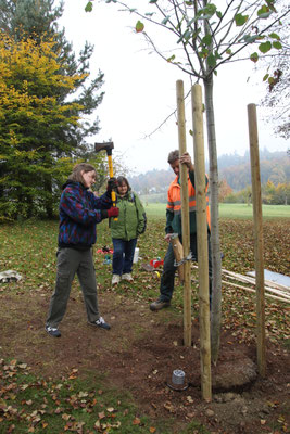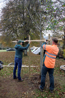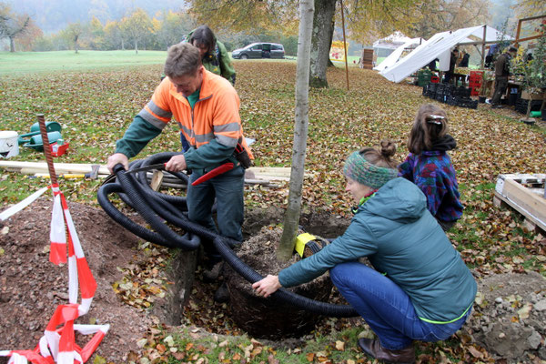 Inzwischen ist der kommunale Wahlkampf in Zofingen abgeschlossen und die SP konnte das benötigte Geld zusammentragen, um der Stadt die Sommerlinde übergeben zu können. Deshalb wurde in enger Absprache mit dem städtischen Werkhof ein geeigneter Standort evaluiert. Die bevorzugte Lösung für die SP wäre es gewesen, die Linde irgendwo direkt im Siedlungsraum anzupflanzen, wo sie die direkteste Wirkung hätte entfalten können. Es sind zurzeit zwar verschiedene städtische Bauprojekte in Planung, welche zusätzliche Bäume umfassen. Die früheste Möglichkeit, die SP-Linde effektiv einpflanzen zu können, hätte sich aber erst in rund einem Jahr an der Oberen Mühlemattstrasse ergeben. Die Perspektive, den Baum während der kommenden Monate im Topf weiterpflegen zu müssen, bis dieses Bauprojekt auf dem entsprechenden Stand gewesen wäre, erschien allerdings suboptimal. Es wurde deshalb entschieden, für die Sommerlinde einen Standort auf dem Heitern zu wählen: So sollte sie benutzt werden, um eine Lücke in der Baumreihe am Nordrand der Stichstrasse auf den Heiternplatz zu schliessen. Just zu Beginn des gleichenorts stattfindenden Reutenmarkts wurde das Ansinnen in die Tat umgesetzt: Unter der fachkundigen Anleitung von Einwohner- und Grossrat Michael Wacker, seines Zeichens Fachmann für naturnahmen Gartenbau, nahmen Franziska Kremer, Hansruedi Sommer, Yvonne Lehmann, Elisa Scheidegger und Laura Kerstjens, welche alle am 28. Oktober 2025 (wieder) in den Einwohnerrat gewählt worden waren, das Unterfangen an die Hand. Dabei wurde die Sommerlinde nicht einfach nur eingepflanzt, sondern zusätzlich mit einem Bewässerungssystem und einer Dreipfahlstütze versehen, um ihr Gedeihen am neuen Standort optimal zu unterstützen. Die SP Zofingen freut sich, dass so aus etwas normalerweise so kurzlebigem, wie einem kommunalen Wahlkampf, etwas erwachsen konnte, was der Stadt Zofingen hoffentlich über Jahrzehnte einen Nutzen bringen kann und dankt allen Spendenden ganz herzlich, welche dieses Geschenk an die Stadt überhaupt erst möglich gemacht haben! (CN)